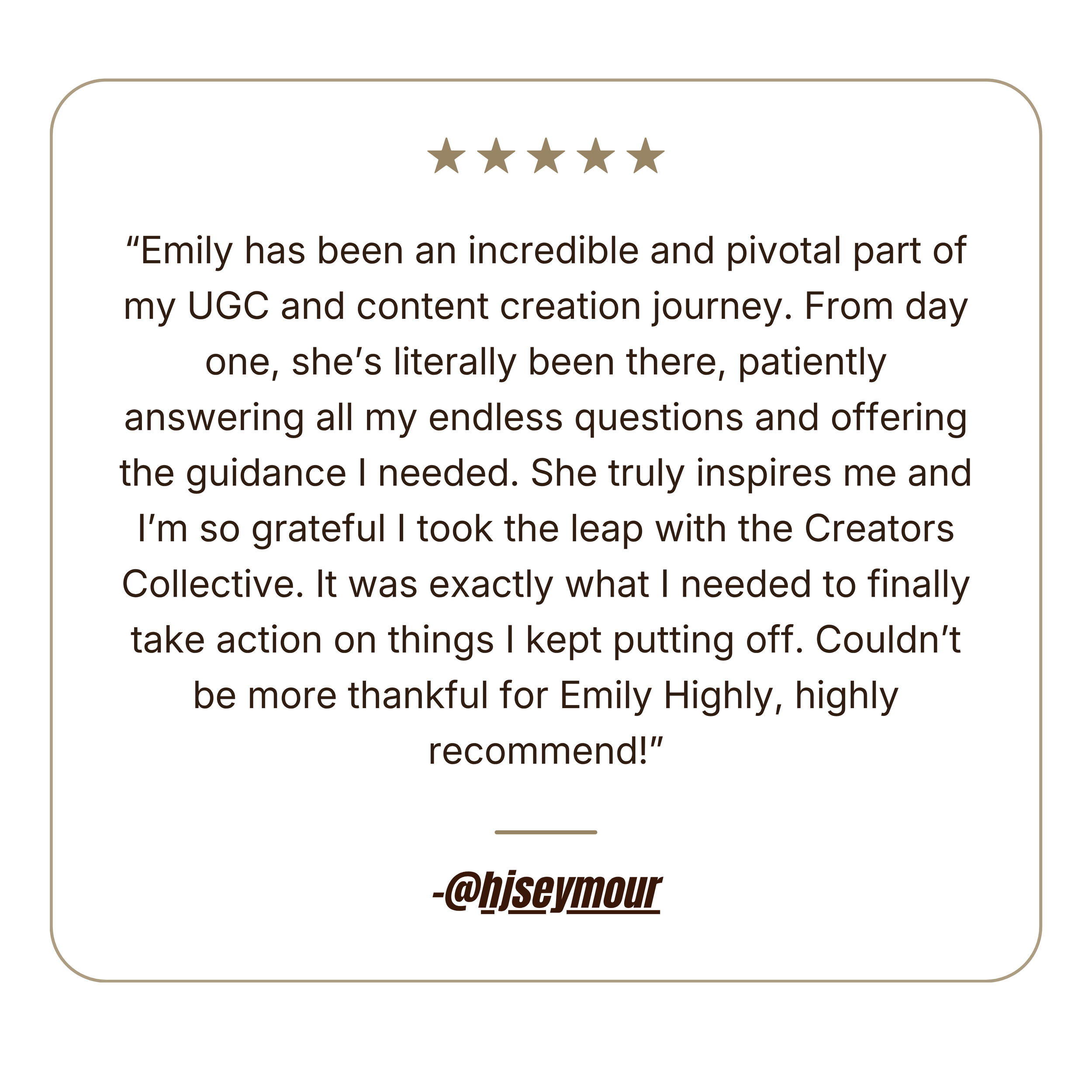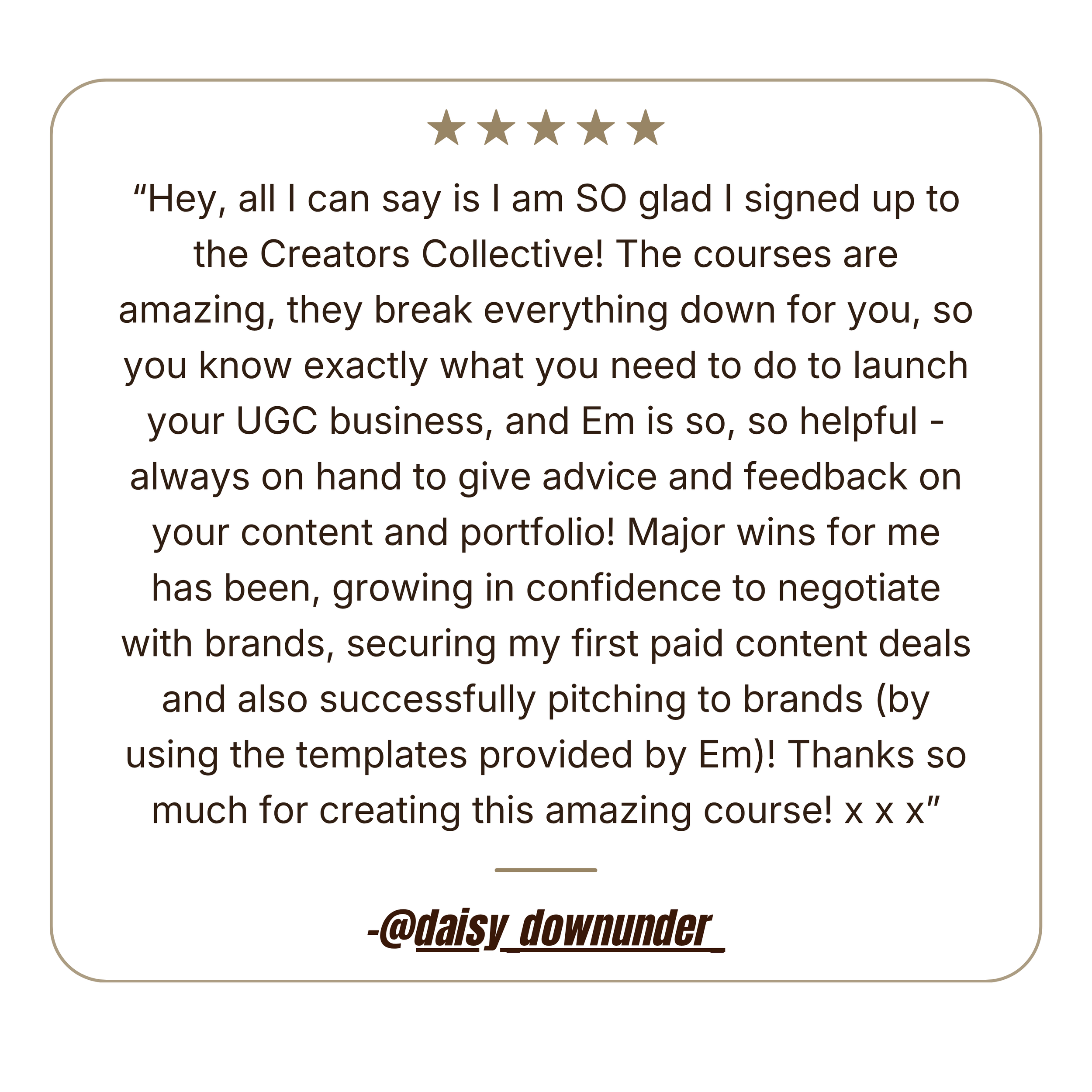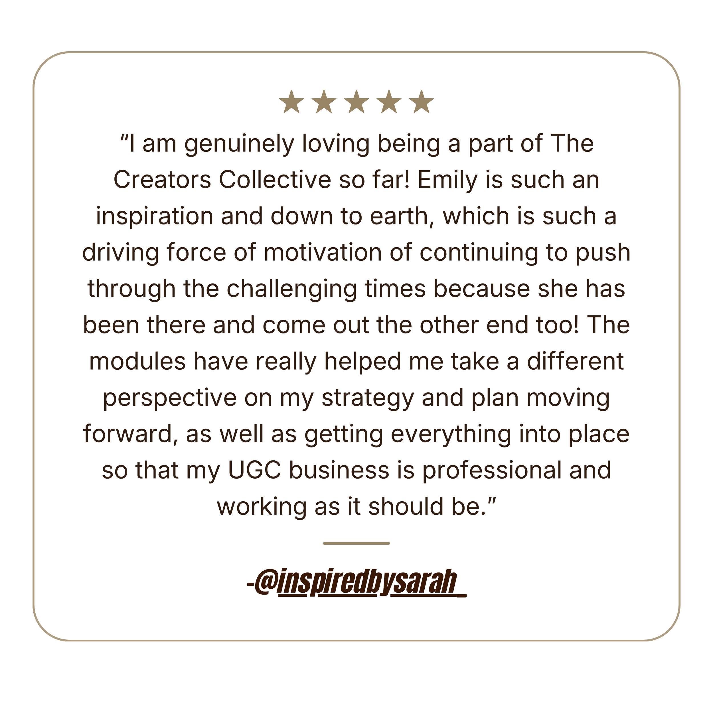 I’ve poured hours into learning from the best in the industry, testing strategies myself, and building frameworks and systems that take the guesswork out of UGC. Inside Creators Collective, I guide creators at every stage, from complete beginner to confident professional, giving them the tools, support, and roadmap to succeed without having to figure it all out on their own.